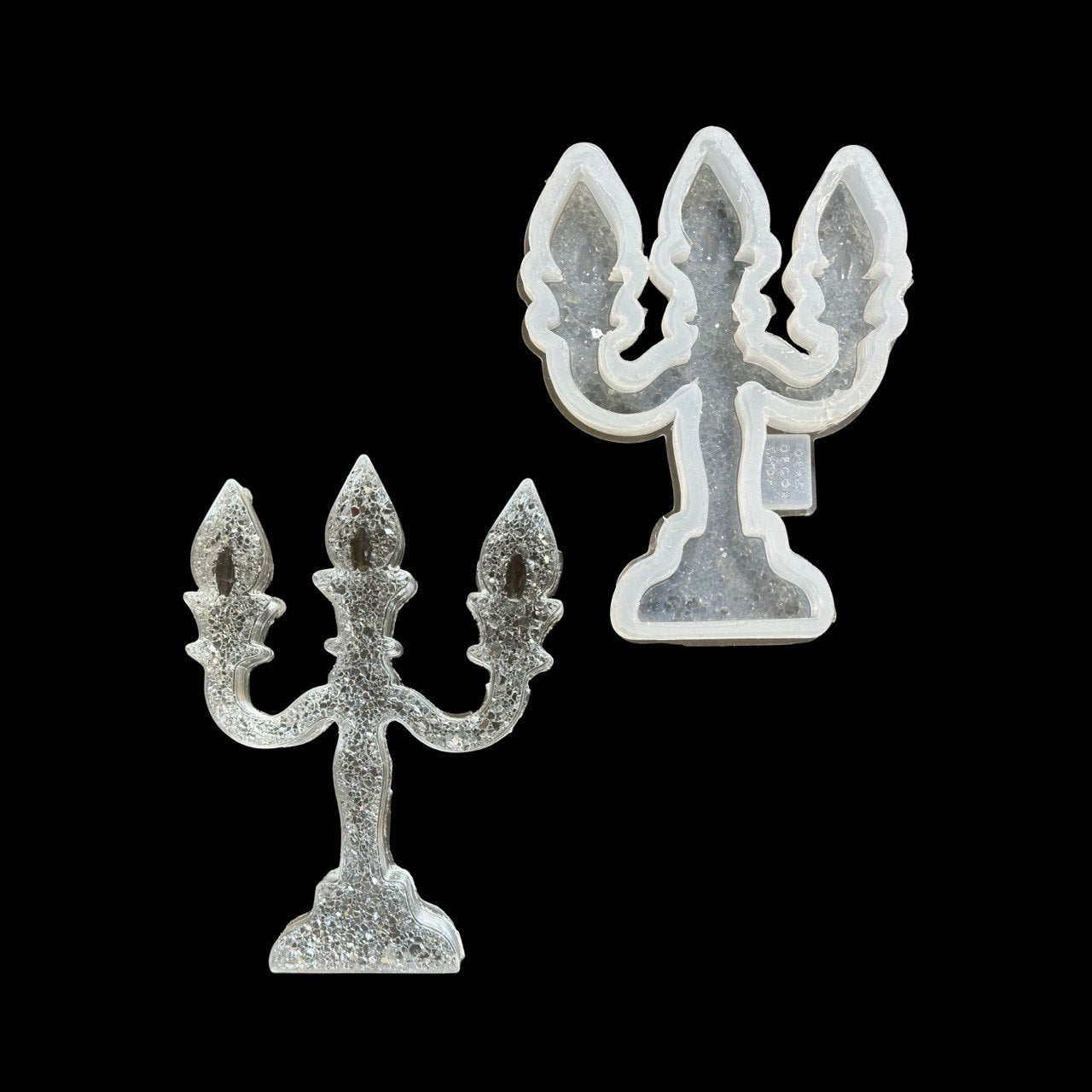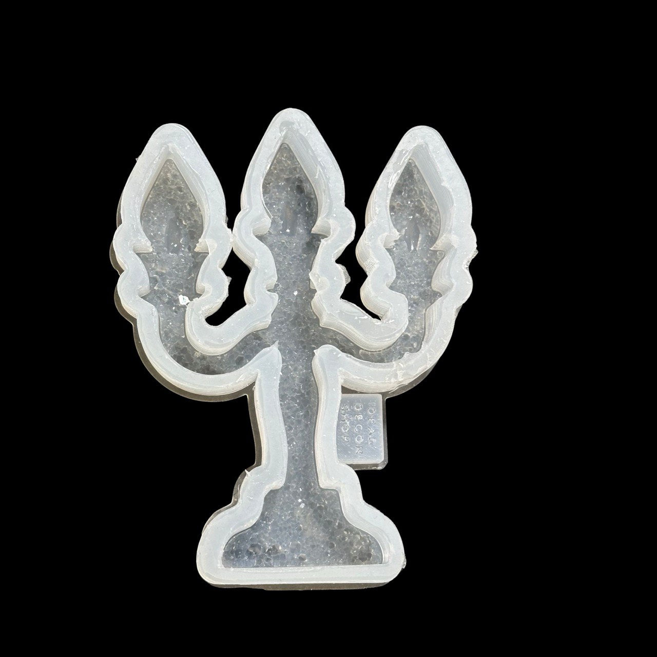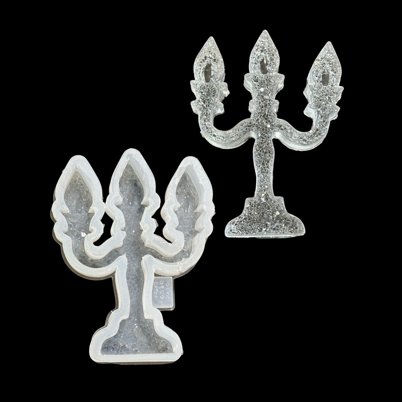 Create stunning resin pieces with this druzy crystal-effect silicone form shaped like an elegant three-arm candleholder.