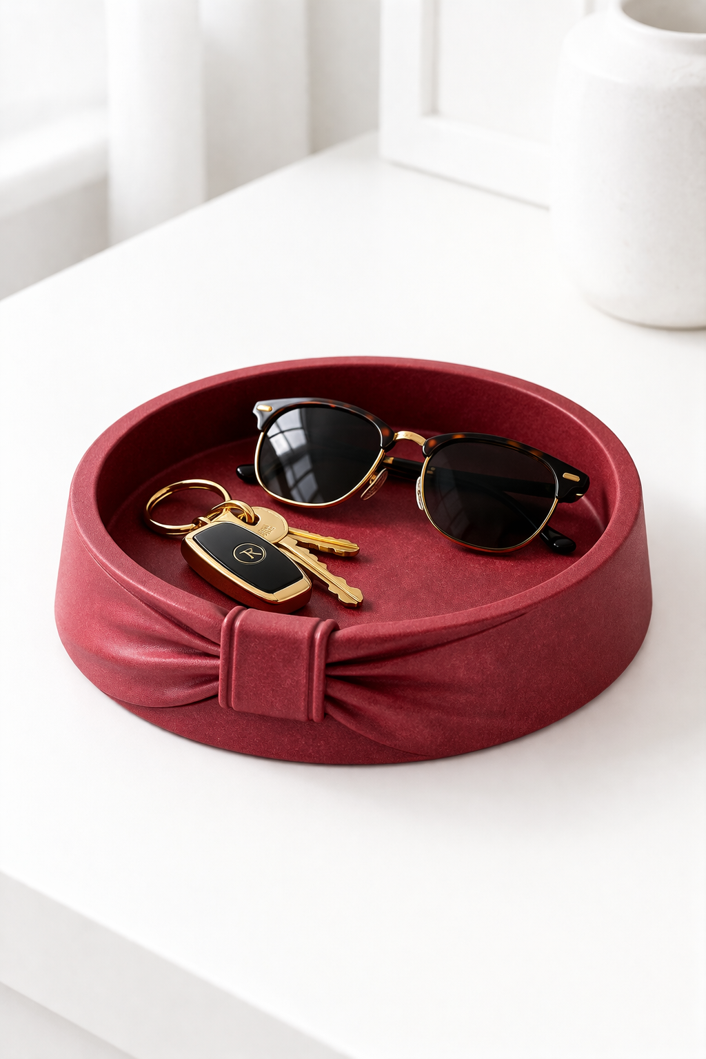 This design combines a clean oval form with a delicate ribbon detail, making it perfect for modern feminine decor and gift-ready pieces.