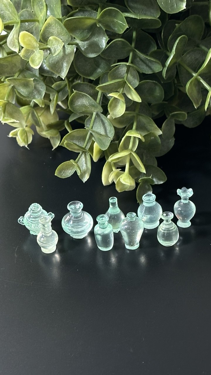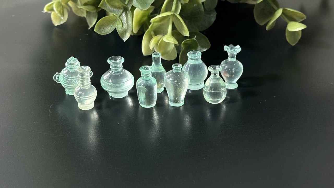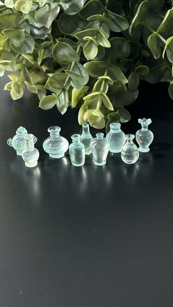 Each bottle has a unique silhouette with fine details such as curves, stoppers, and neck designs — ideal for resin inclusions, fairy garden accessories, dollhouse décor, jewelry, or creative gift projects.