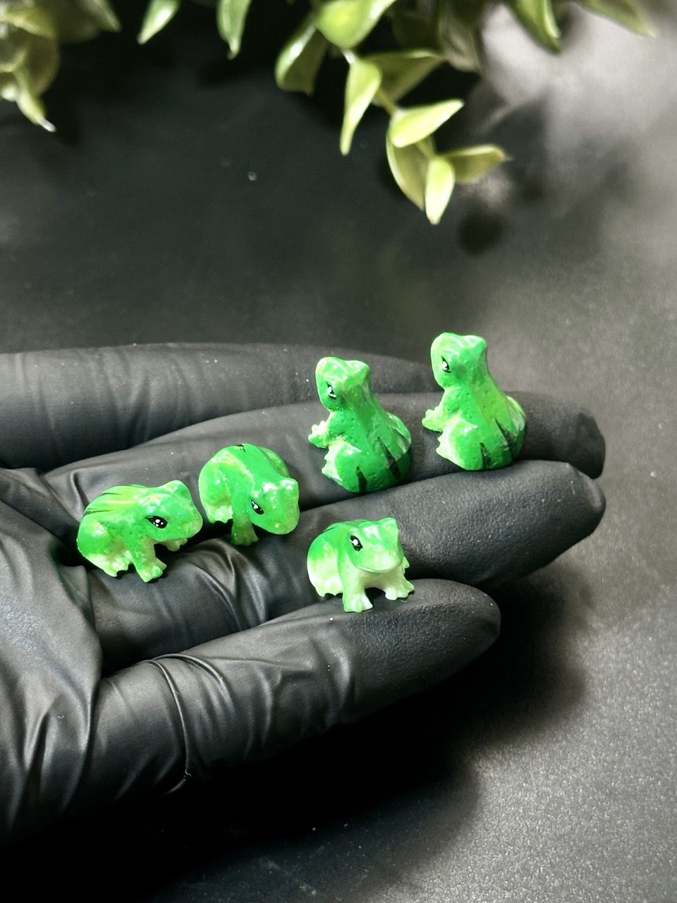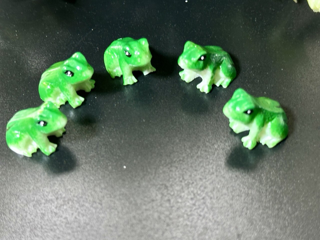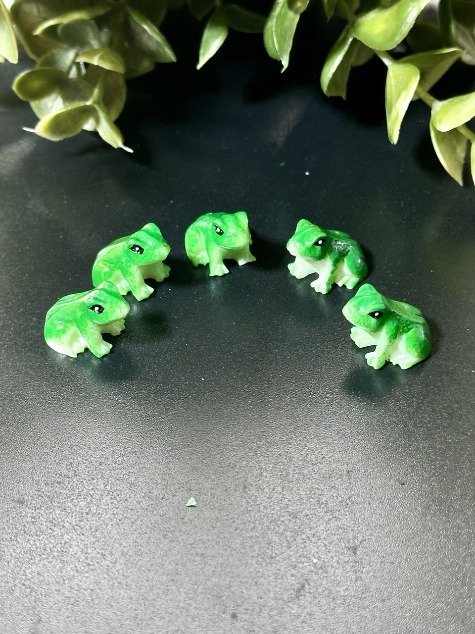 This silicone mold creates mini frog figurines—a set of 5 cavities sized for resin, jesmonite, plaster, candle wax, and soap. Each finished frog is about 2 cm tall × 1.2 cm wide, perfect for charms, earrings, shaker fillers, or terrariums.