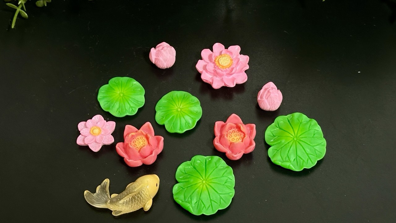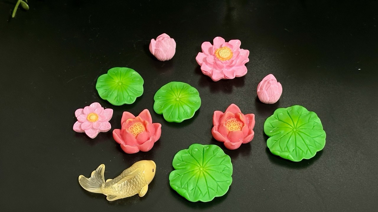 Create a beautiful mini pond scene with this detailed silicone mold set featuring lotus flowers, lily pads, buds and a koi-style fish.
