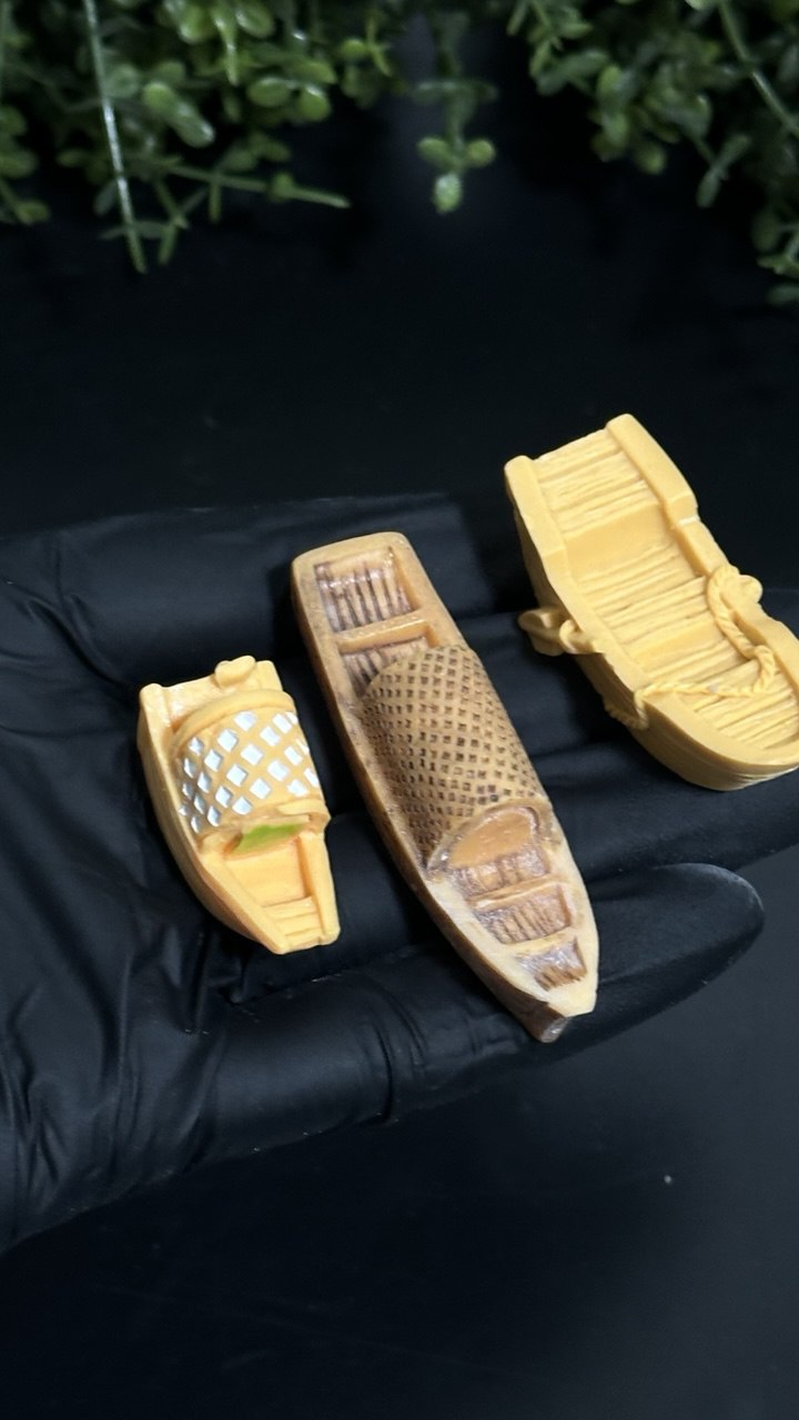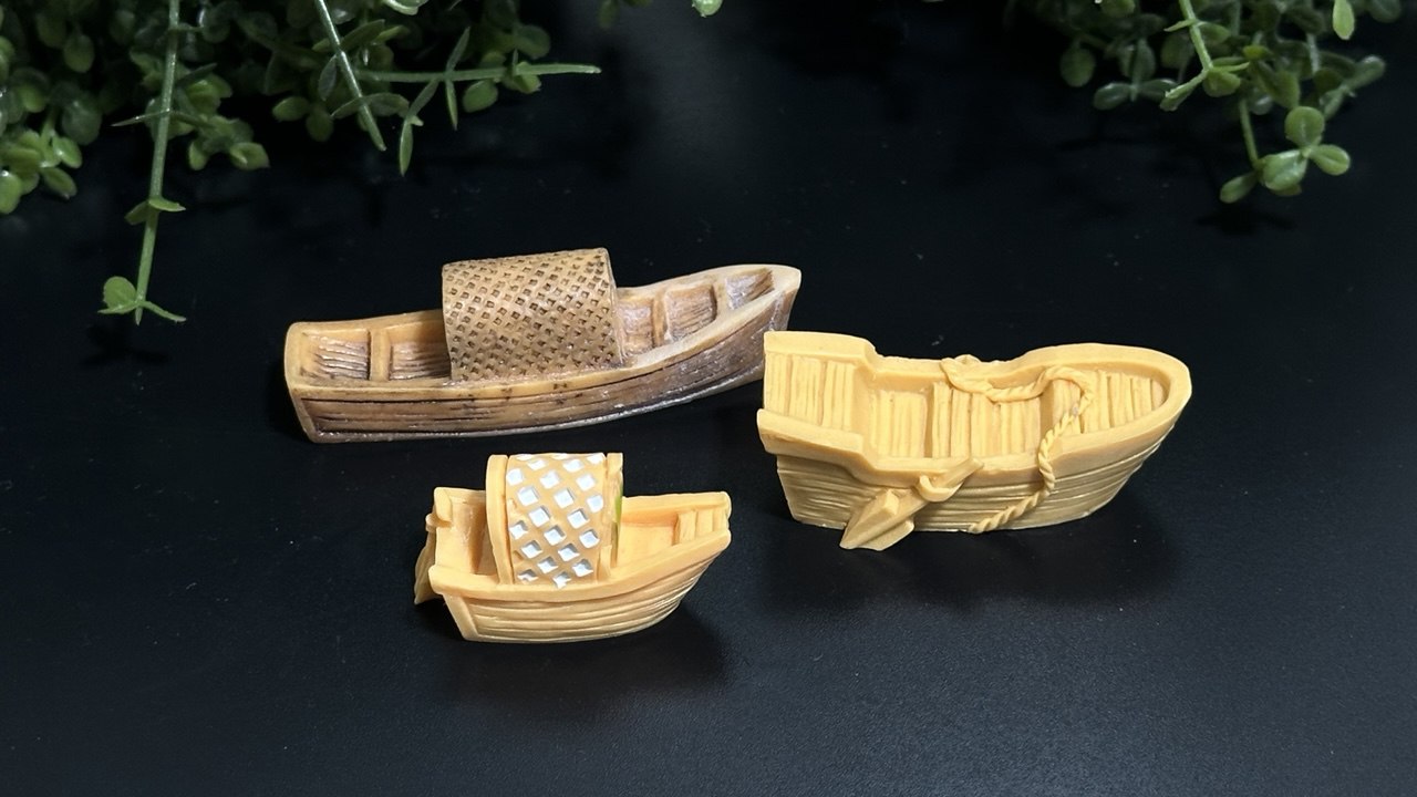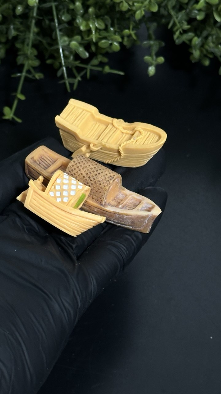 This silicone mold features three detailed miniature boats inspired by traditional wooden fishing boats. The designs resemble classic rowboats / small fishing boats commonly used in rivers, lakes, and coastal areas.